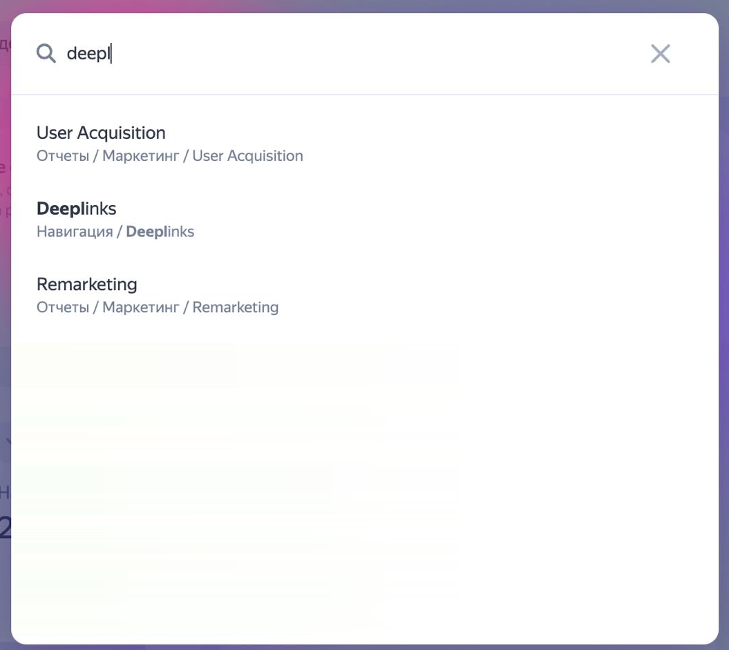 Вы можете найти любой термин, отчет, метрику, воркспейс или настройку в едином окне. Для этого нажмите Поиск вверху справа. Кнопка доступна из любого раздела сервиса.