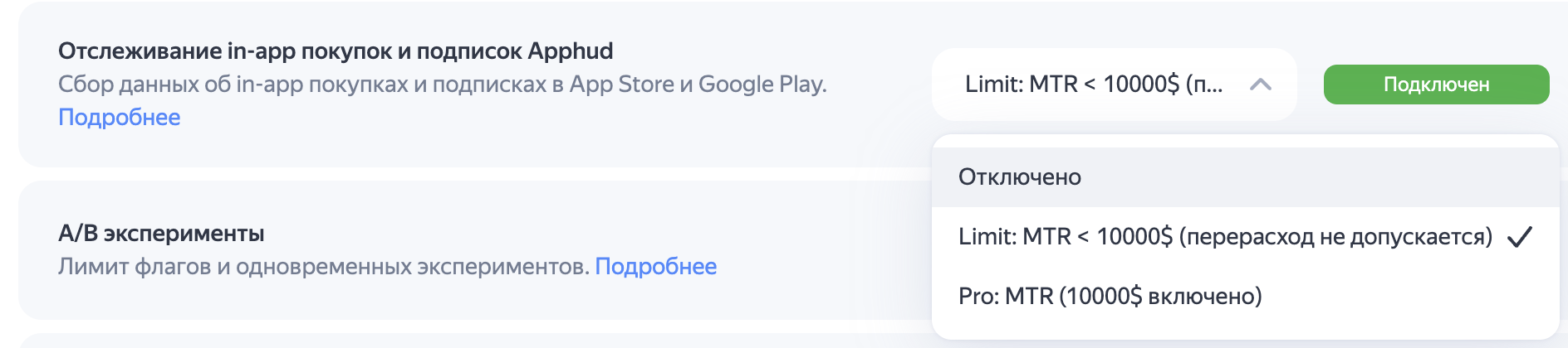 Трекинг через Apphud — платная опция, которая доступна на тарифах Custom и Pro. У опции есть бесплатный лимит MTR < 10000$.
