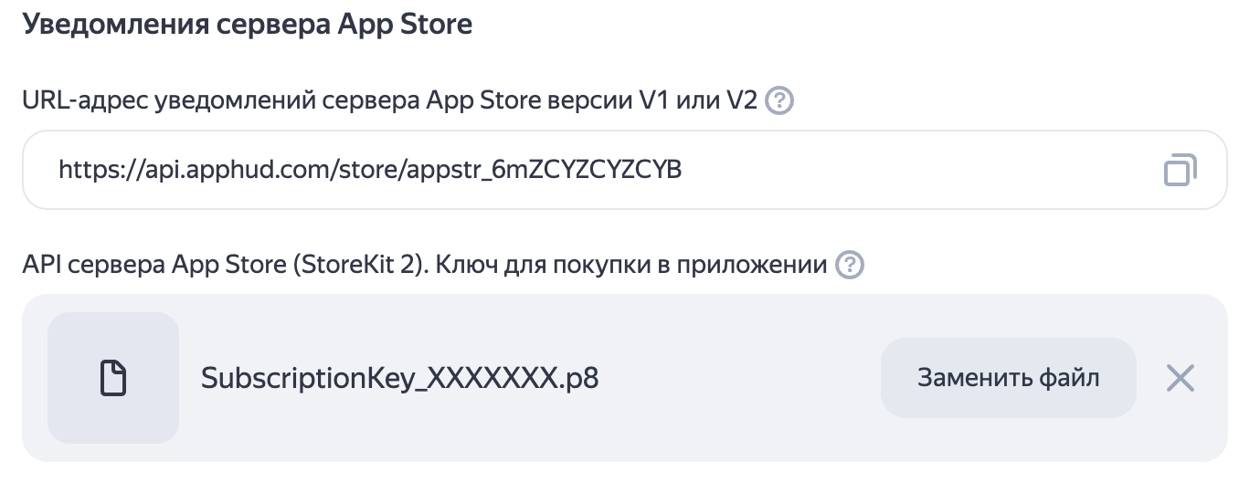 После загрузки In-App Purchase Key в интерфейсе появится строка — это URL-адрес для настройки уведомлений от App Store Server Notifications.