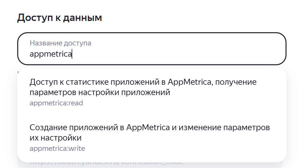4. В разделе Доступ к данным укажите appmetrica:read и appmetrica:write. Чтобы доступы появились в выпадающем списке, начните вводить их название.