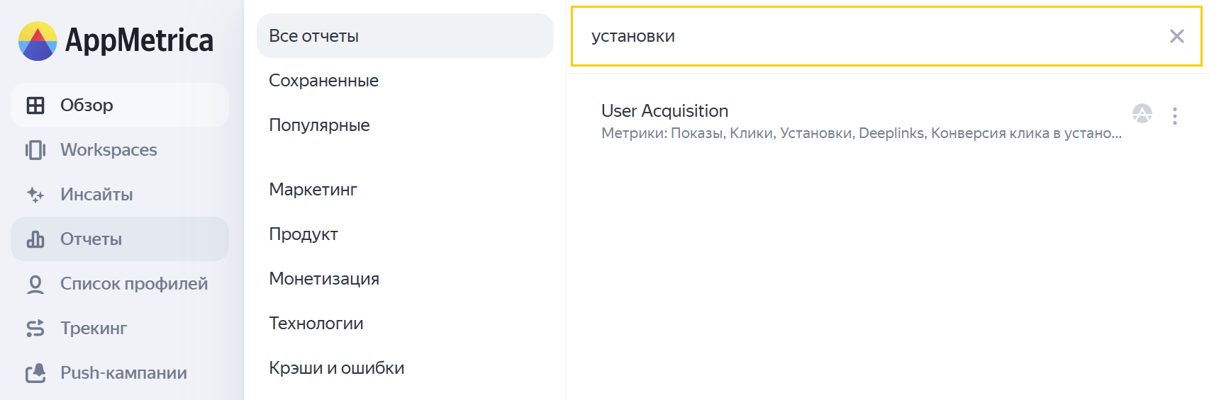 Используйте строку поиска, чтобы найти отчет по названию, включая сохраненные отчеты, или по названию метрики в отчете.
