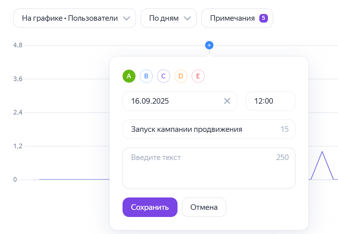 Найдите на шкале времени нужную дату и нажмите на соответствующую точку на графике — откроется окно создания примечания.