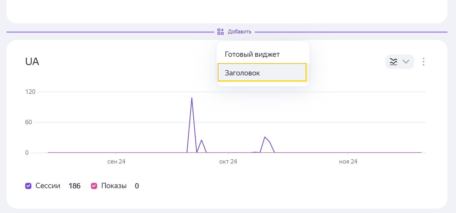 Чтобы добавить заголовок, наведите указатель мыши между виджетами и нажмите Добавить → Заголовок.