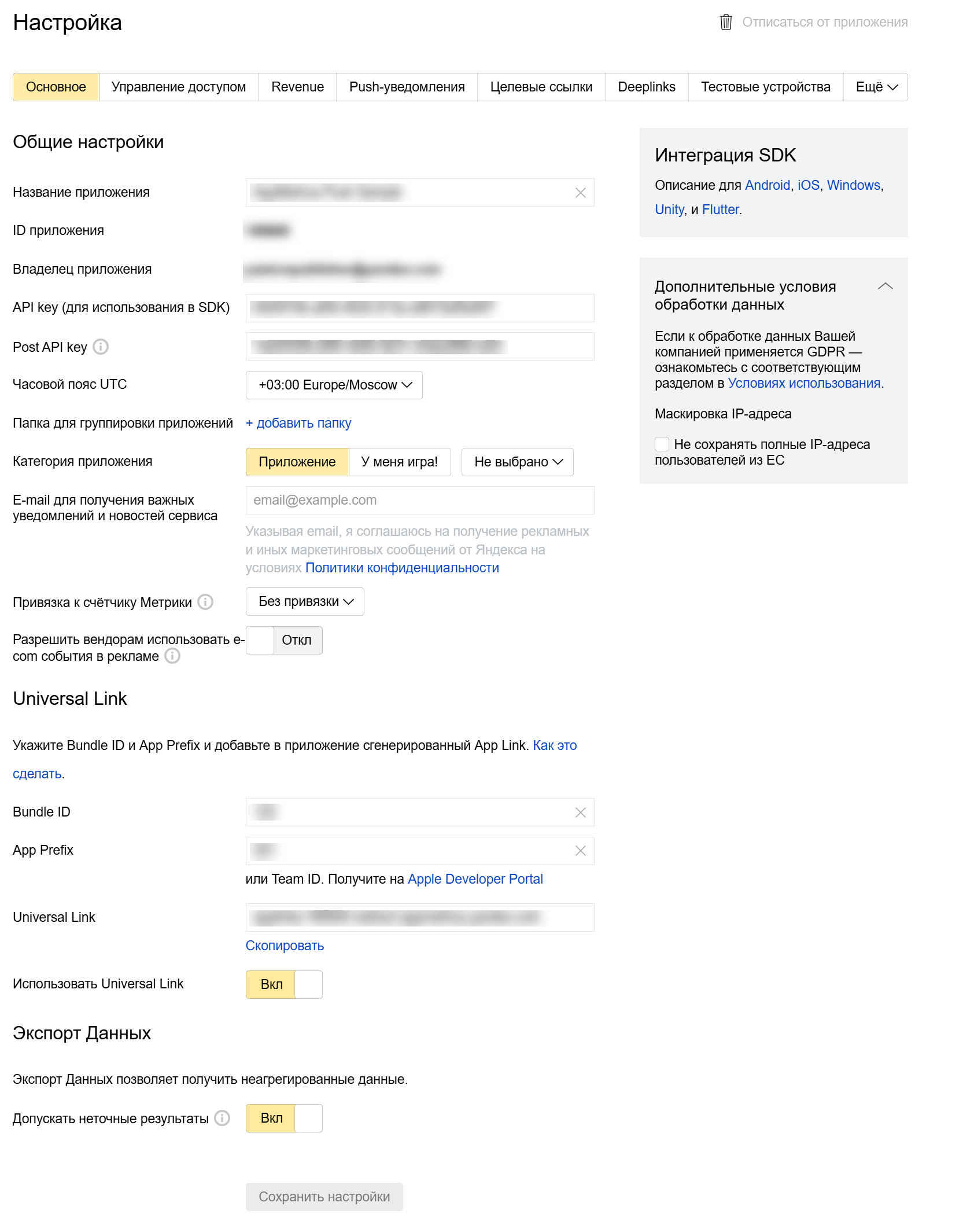Рекомендуем для одного и того же приложения на разных платформах использовать один API-ключ. Это позволит удобнее просматривать общую статистику приложения, статистику по отдельной платформе, а также даст возможность использовать smartlink в трекерах.
