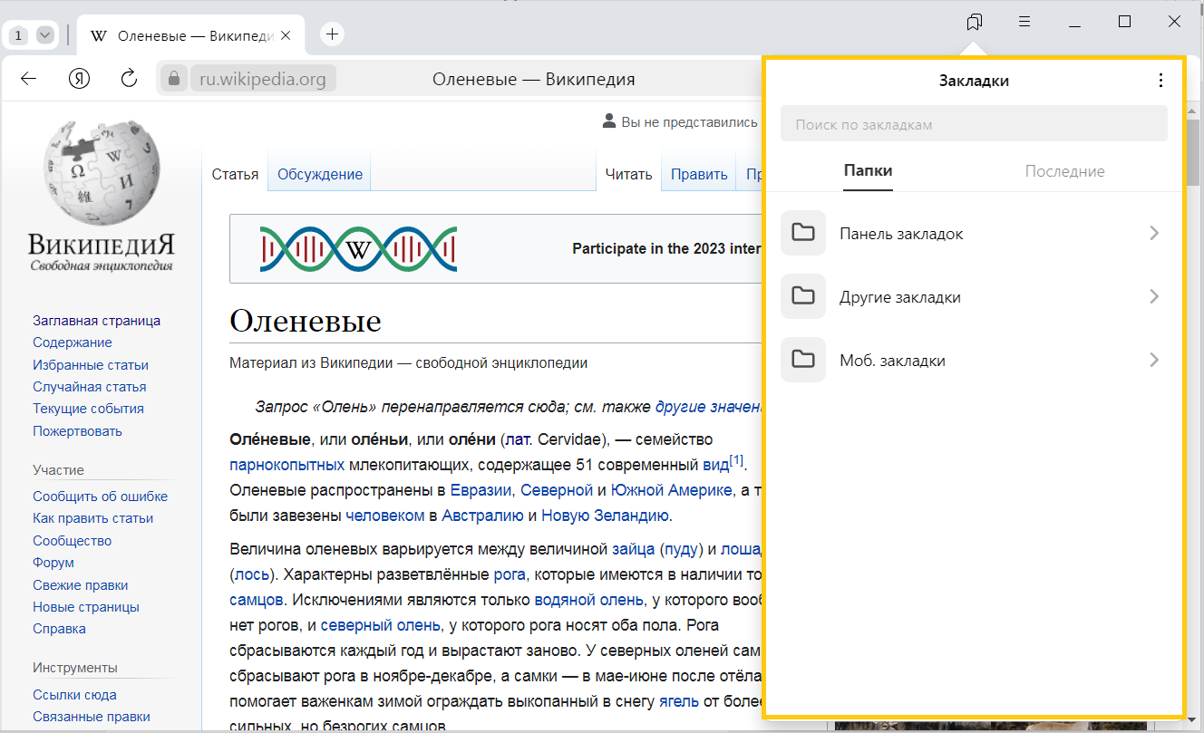Если вы импортировали закладки из другого браузера, то перенесенные папки также появятся в левом меню. При этом названия папок останутся прежними. Подробнее см. раздел Импорт закладок.