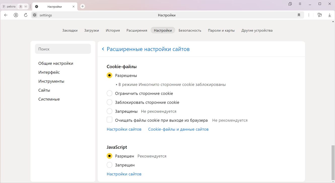 3. В разделе Сookie-файлы нажмите Настройки сайтов.