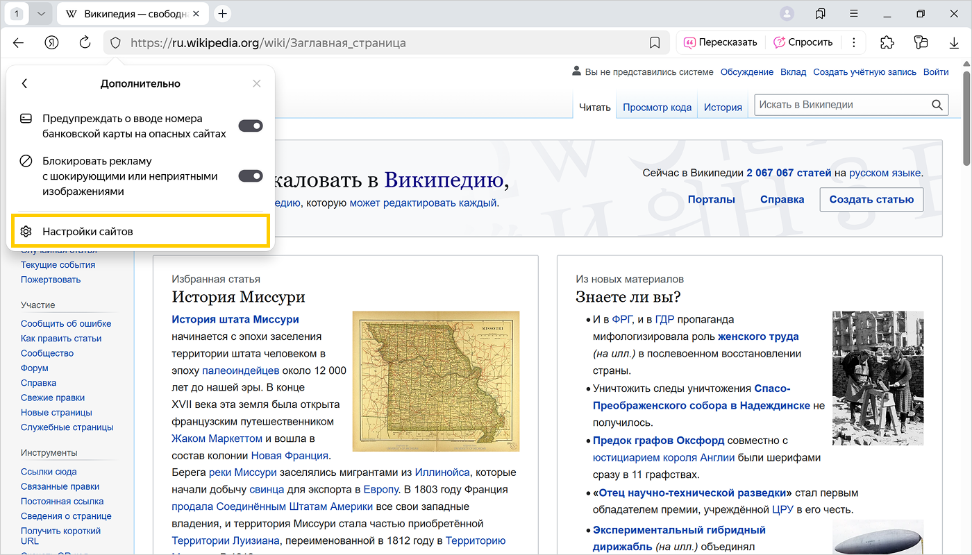 На открывшейся панели Нейропротект нажмите Дополнительно → Настройки сайтов.