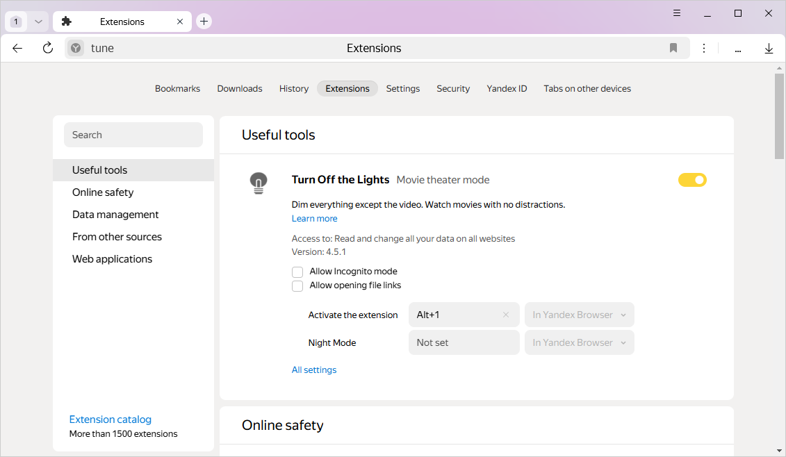 Extensions are mini-programs that provide new features. For example, they can block bothersome ads, enable night mode, or manage passwords. In Yandex Browser, you can install extensions created by the developers of Yandex Browser or from the third-party catalogs, Google Chrome and Opera.