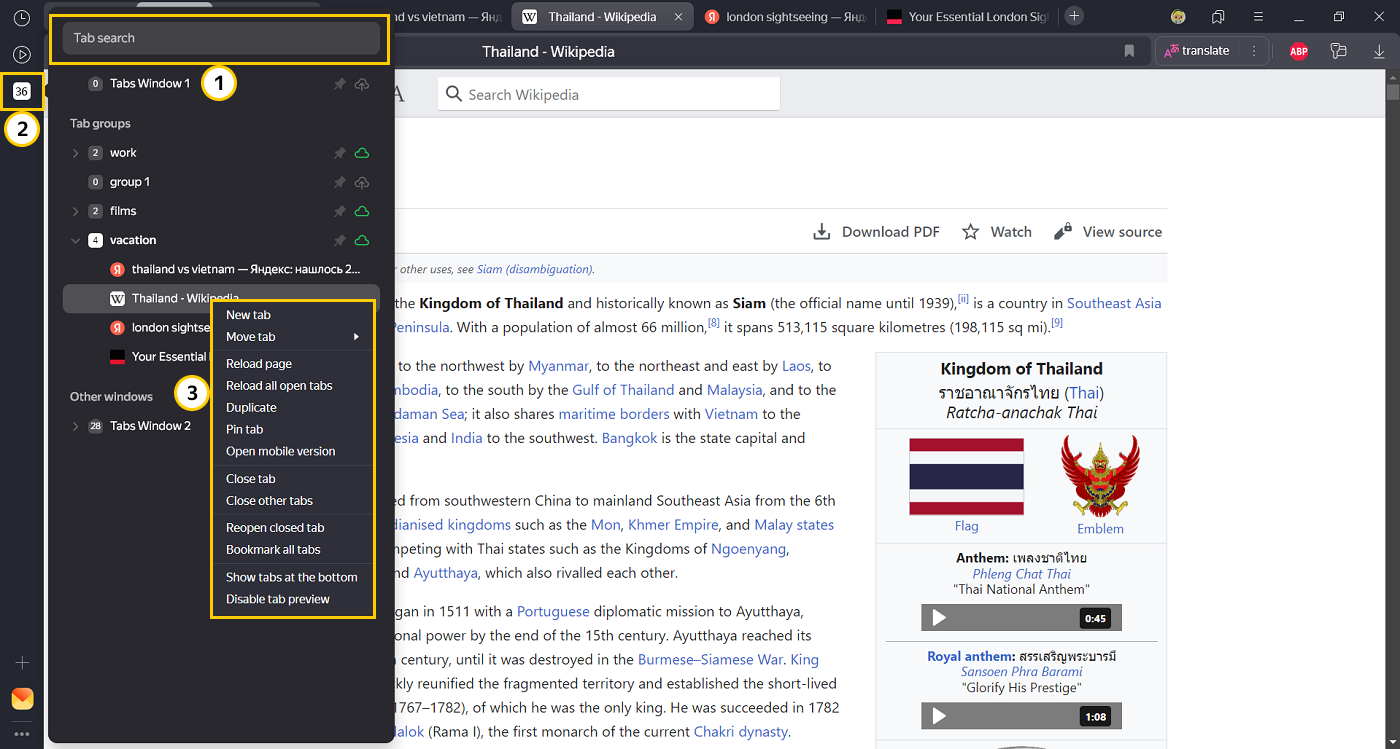 When a lot of tabs are open, they may become difficult to navigate.Yandex Browser contains a special panel for managing a large number of tabs. The panel displays tabs in a vertical list that's divided into groups.