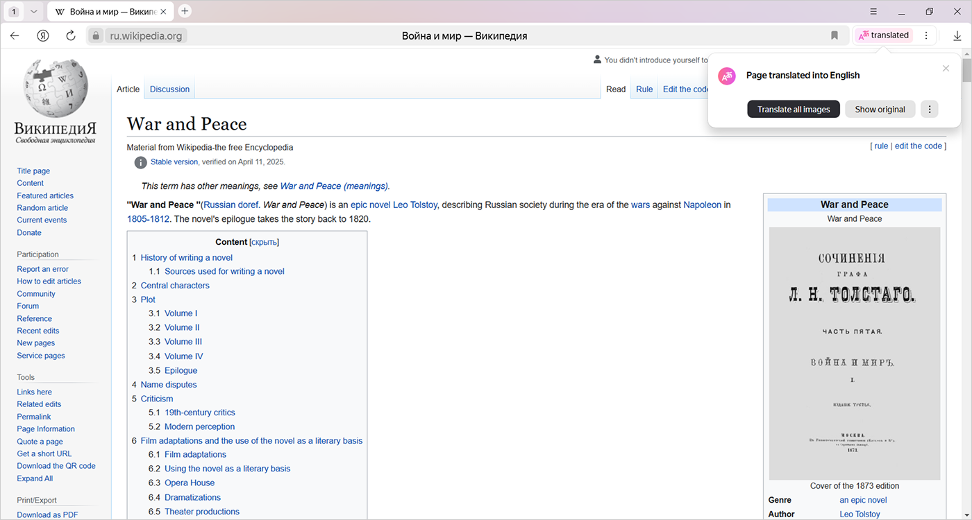 Yandex Browser will prompt you to translate the page if its language is different from your interface language. You can access Yandex Translate or translate specific words, images or videos using the context menu.