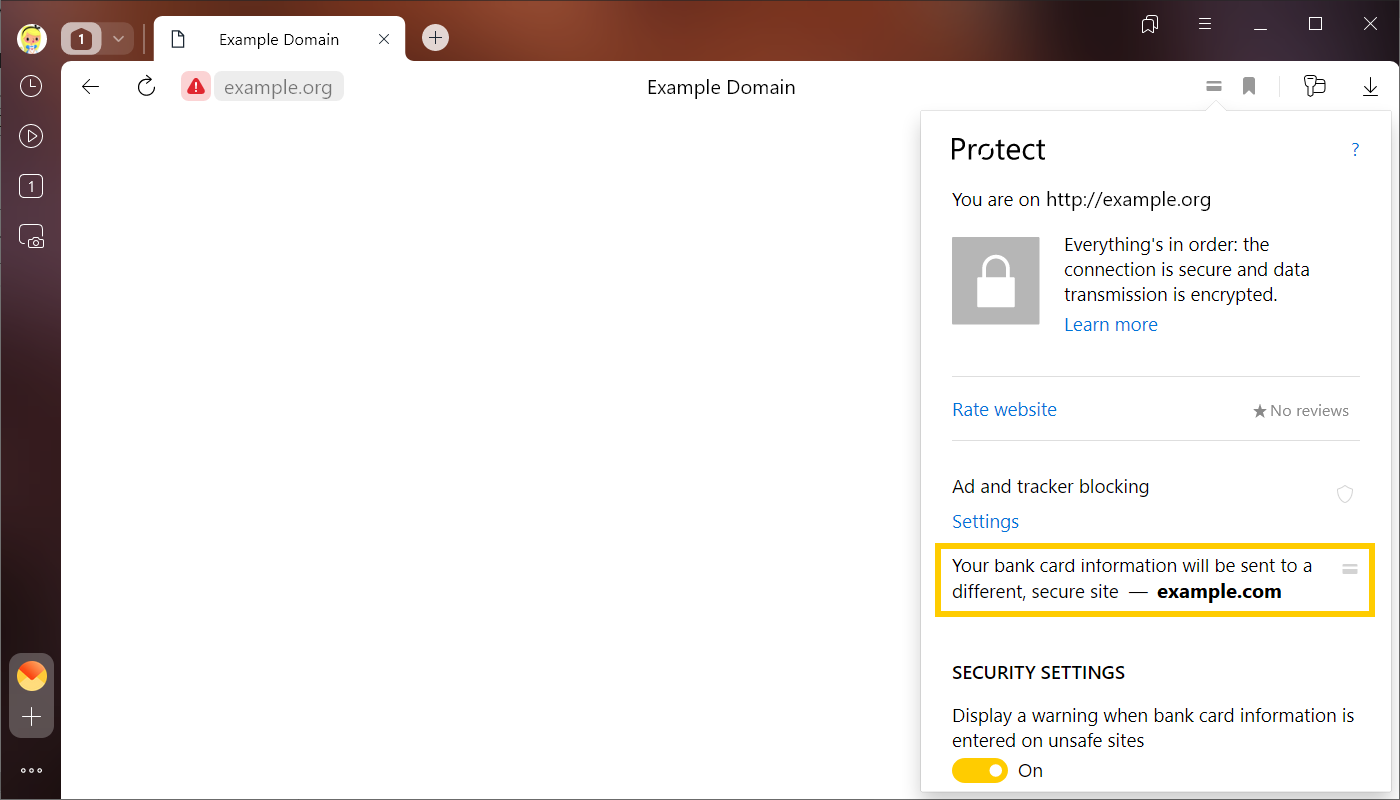 The connection with this site is not encrypted, but your bank card data will be sent to example.com, which is secure. |