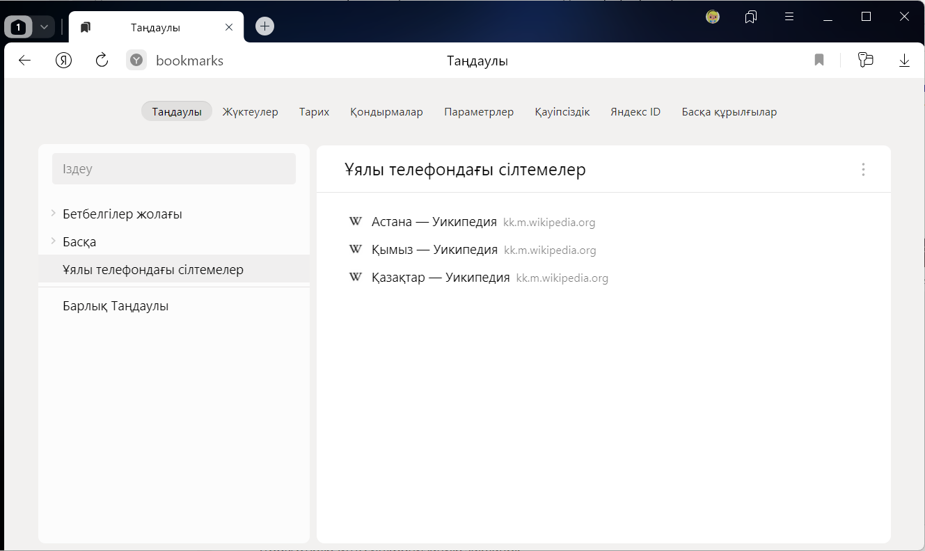 Синхрондаудан кейін Браузерде барлық синхрондалған құрылғылардан (компьютер, планшет, смартфон) бетбелгілер көрсетіледі.