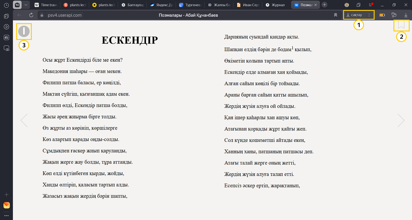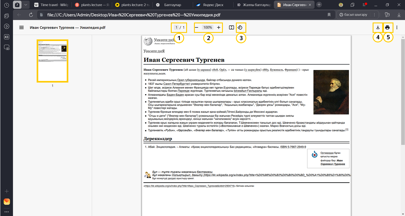 Интернетте табылған файлдарды тікелей Яндекс Браузерде көруге болады. Файлдарды жүктегеннен кейін әдепкі қолдау көрсетілетін пішімдер Браузерде ашылады. Егер сайт иесі файлдарды автоматты түрде сақтауға тыйым салды, файл компьютерде сақталады. Сіз оны бірден қолмен ашуыңызға болады. Файлдарды көру кезінде, оларды Браузер терезесінде көрсете отырып, электронды кітаптарда бетбелгілерді жасауға болады.