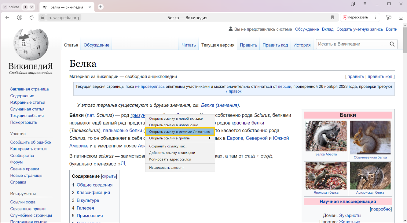 • Нажмите ссылку правой кнопкой мыши и выберите Открыть ссылку в режиме Инкогнито.