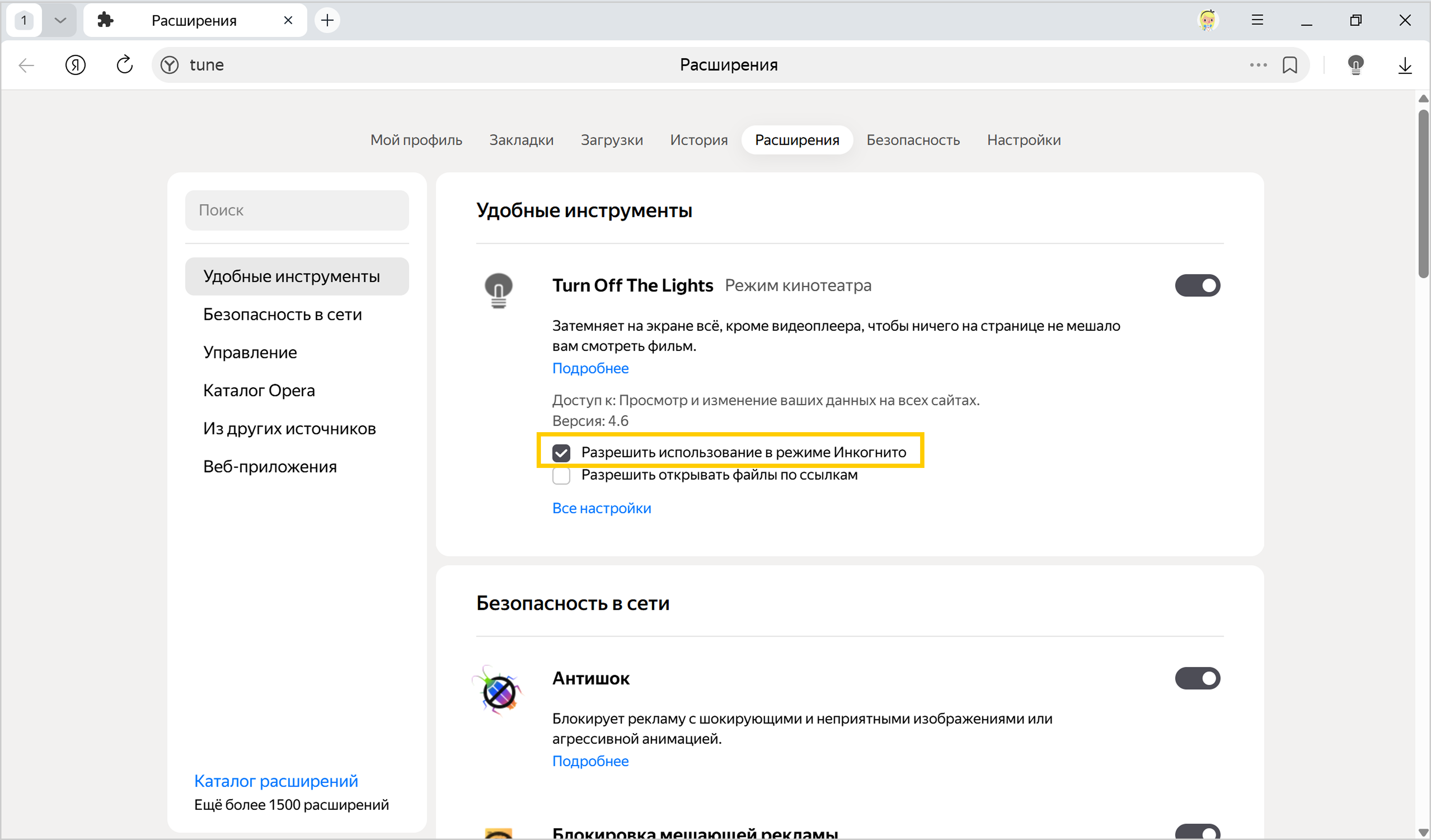 По умолчанию в режиме Инкогнито расширения отключены. Некоторые из них можно включить вручную. Чтобы включить расширение: