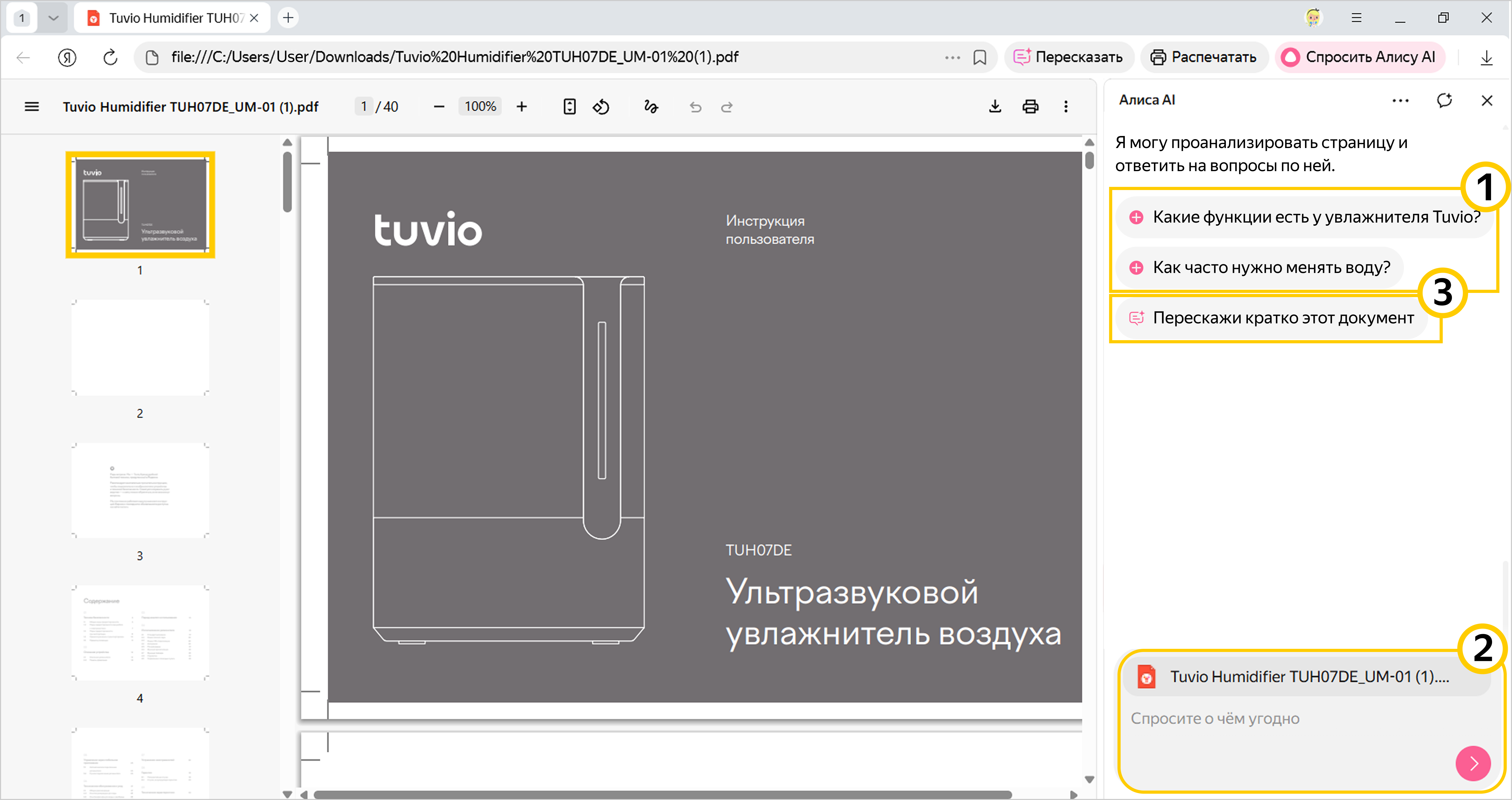 1 Нажмите на один из предложенных Алисой AI вопросов – они подготовлены с учетом контекста документа.