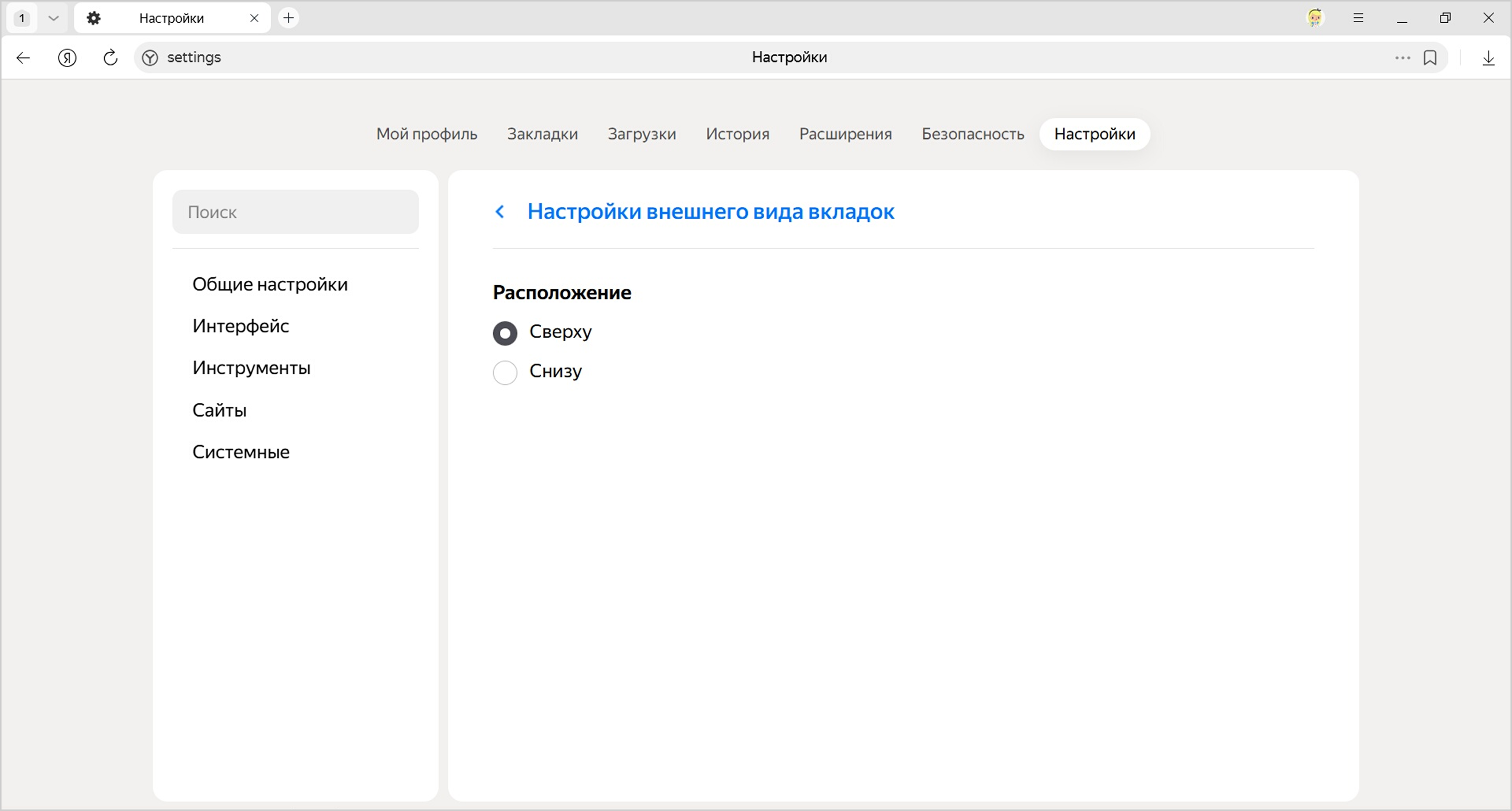 После этого вкладки переедут вниз. Чтобы переместить вкладки наверх, включите в настройках в разделе Настройки внешнего вида вкладок опцию Сверху.