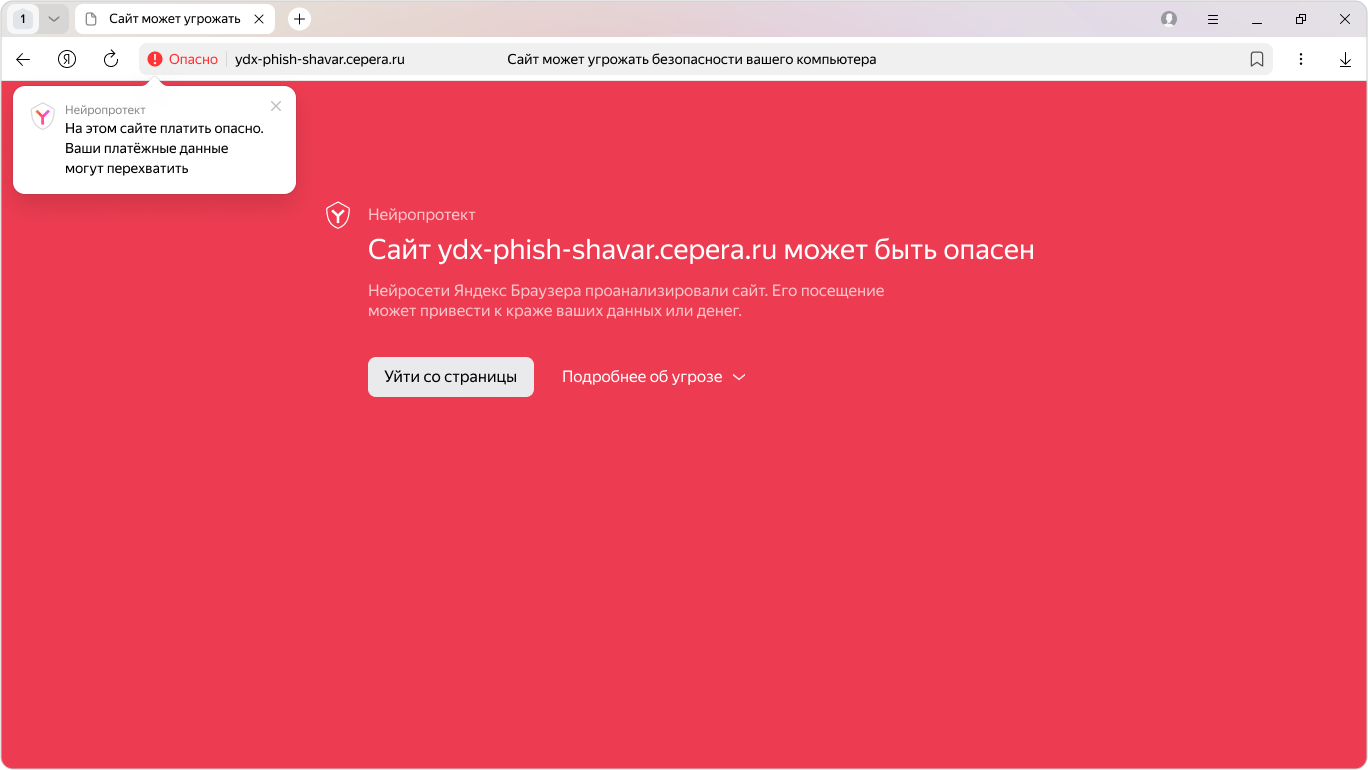 При вводе номера платежной карты Браузер может вывести на экран предупреждение, что присутствует явная угроза кражи данных или проблема с безопасностью. В этом случае в Умной строке появляется значок  и открывается окно с предупреждением.
