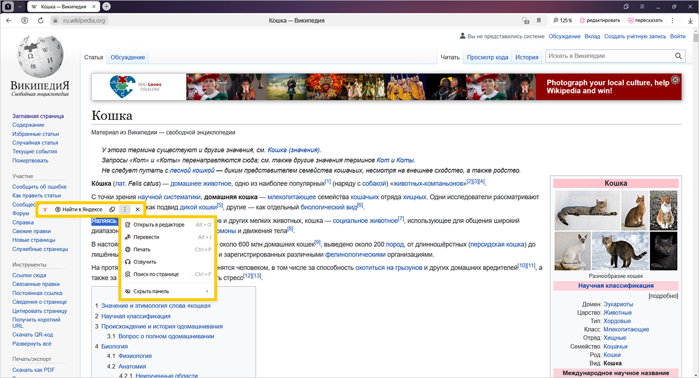 Когда вы выделяете текст на странице сайта, Браузер показывает вам контекстное меню для работы с выделенным фрагментом. Например, вы можете скопировать текст, озвучить его или отправить на печать. Контекстное меню может появляться в виде небольшой панели с кнопками или в виде текстового списка команд.