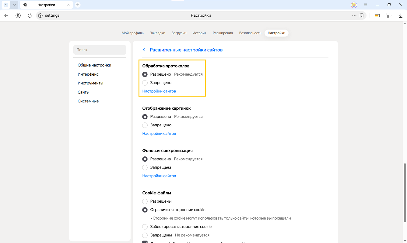 3. В разделе Обработка протоколов нажмите Настройки сайтов.