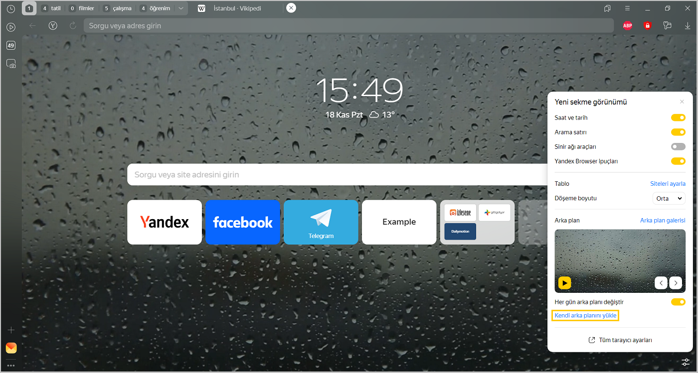 Yeni sekmede bağlantı metinlerinin ve buton adlarının kolayca okunabilmesi için bilgisayardan yüklenen tüm arka planlara karartma filtresi uygulanır. Bu filtre devre dışı bırakılamaz. Arka planın daha açık renklerde olmasını istiyorsanız yüklediğiniz görselin parlaklığını arttırın.