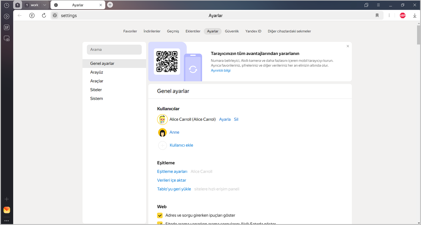 bazı ayarlar, örneğin, sitelere verilmiş olan izinler veya Yandex Browser'ın dili.