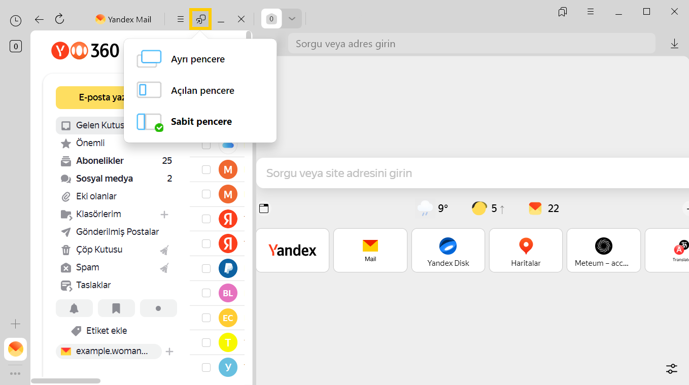 Favori servislerinizi web uygulamaları gibi kullanabilmek için onları yan panele ekleyin; böylece bunları tek tıkla açabilir ve sürekli istenilen sekmeyi aramaktansa ayrı bir pencerede bu servislere kolayca erişirsiniz. Örneğin, Yandex Browser’ın birçok sekme içeren ana penceresini açmadan Yandex Mail’deki e-postaları kontrol edebilir.