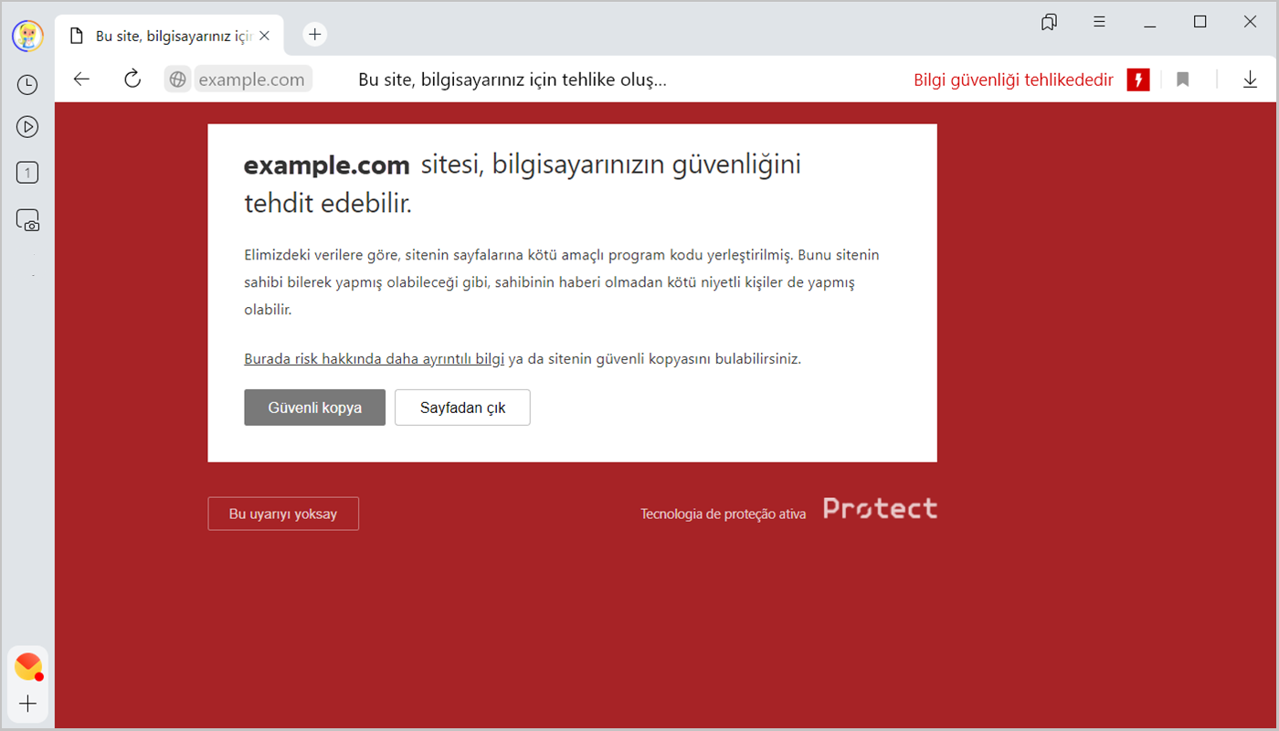 Yandex Browser bir antivirüs uygulamasının koruyucu özelliklerinin tümüne sahip olmasa da sisteminiz için zararlı olabilecek bir siteye girdiğinizde sizi uyarabilir. Protect teknolojisi aynı zamanda, antivirüs uygulamalarının engellemediği bilgisayar tehditlerine karşı tarayıcıyı korur. Tam koruma için her ikisinin de kullanılmasını öneriyoruz.