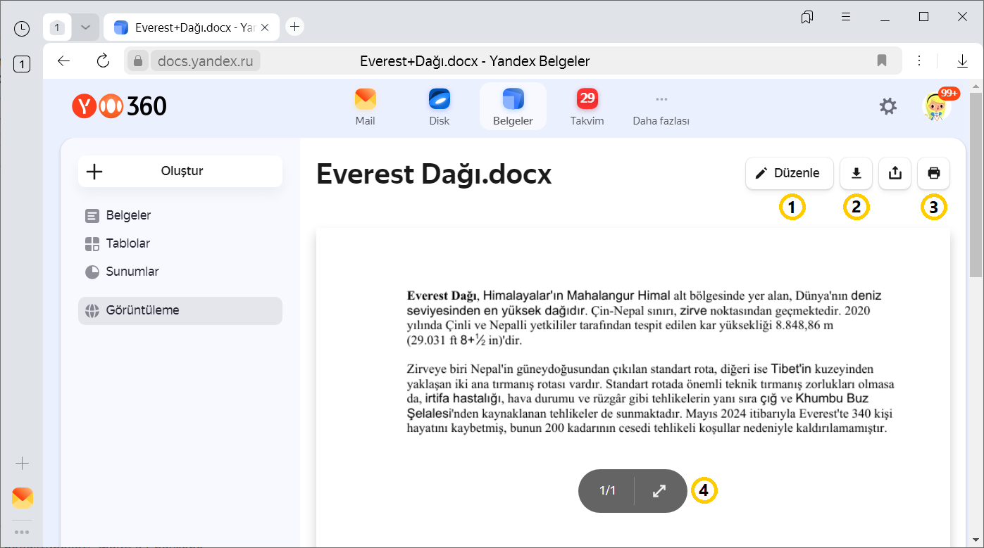 Yandex Browser’da açılan belgeler, tablolar ve sunumlar Yandex Belgeler yardımı ile düzenlenebilir. Bunu yapmak için belgenin üst kısmındaki Kopyayı düzenle butonuna tıklayın. Belgenin bir kopyası Yandex Disk'te İndirilenler klasörüne kaydedilir. Ayrıca belgeleri, arkadaşlarınızla veya aynı iş yerinde bulunduğunuz kişilerle çevrimiçi düzenleyebilirsiniz. Daha fazla bilgi için Yandex Belgeler Yardım bölümüne göz atın.