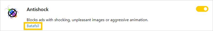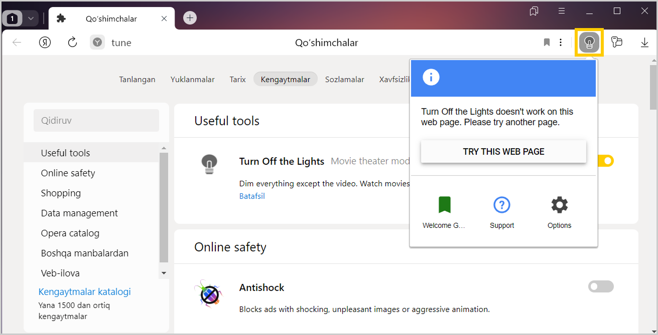 Oldindan oʻrnatilgan kengaytmalarni (Antishok, Reklamani bloklash, Maslahatchi, Pochta va boshqalar) olib tashlash imkonsiz, ularni faolsizlantirish mumkin.