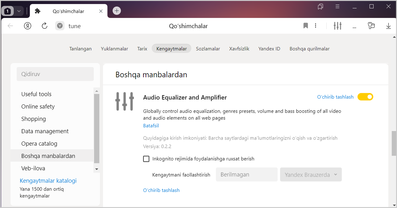 Roʻyxatda oldindan oʻrnatilgan kengaytmalar (masalan, Antishok) va Brauzerning qoʻshimcha funksiyalari (masalan, sinxronlashtirish) keltirilgan.