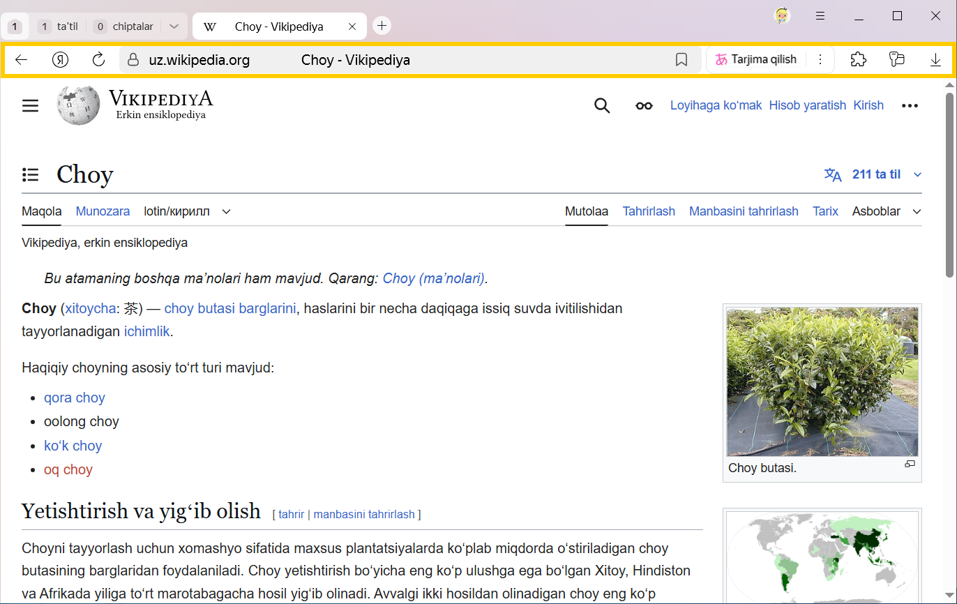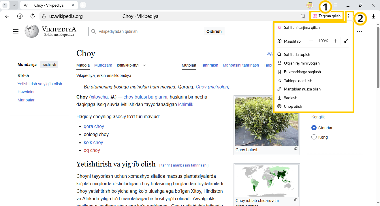 Sahifa menyusini ochish. Barcha sahifa amallari roʻyxatini koʻrish uchun bosing. Masalan: sahifani ovozli qilish yoki tarjima qilish, uni xatchoʻplarga yoki Tabloga qoʻshish. Oʻchmayapti.
