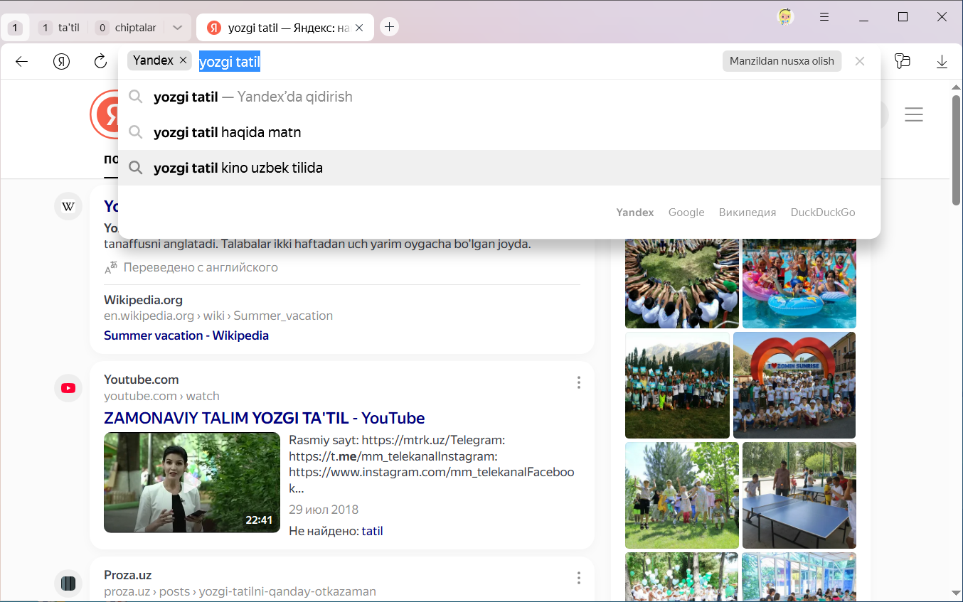 Brauzer kiritilayotgan qidiruv jumlasining tilini avtomatik almashtira oladi. Agar u bunday qilmasa, → Sozlamalar → Vositalar → Sahifa ichidan qidirish tugmasini bosing va Hech narsa topilmasa, terilgan soʻrovni boshqa joylashuvdan qidirish parametri yoqilganini tekshiring.