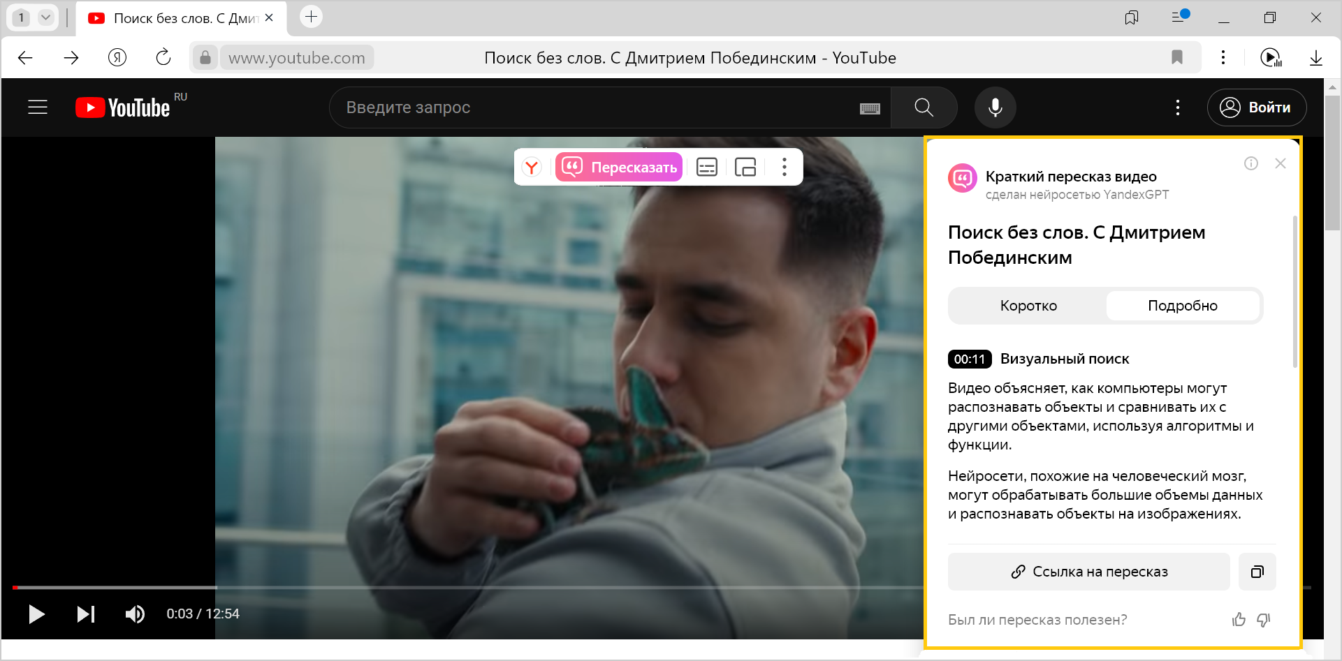 YandexGPT neyron tarmogʻi videoning qisqacha mazmunini aytib beradi va kerakli lahzaga darhol oʻtishingiz uchun vaqt kodlarini ko‘rsatadi. Brauzer rus, ingliz, fransuz, nemis, ispan, italyan, xitoy, yapon va koreys tillarida yaratilgan videolarni qayta hikoya qilishi mumkin. Qayta hikoya qilishning oʻzi rus tilida boʻladi.