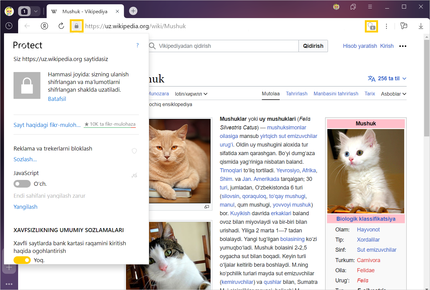 Internetda bexavotir ishlashingiz uchun Yandex Brauzer keng qamrovli Protect himoya tizimidan foydalanadi. Aqlli satrdagi belgilar Protect ma’lumot va sozlamalariga tezkor kirish imkonini olishga yordam beradi.