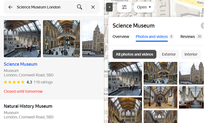 High-quality photos and videos attract user attention. Businesses with higher profile completion and a variety of photos and videos are added to Yandex search results before the other ones. Users are more likely to trust these businesses: they can view the photos and videos to see the company's interior, find it on the map, and check what products it offers.