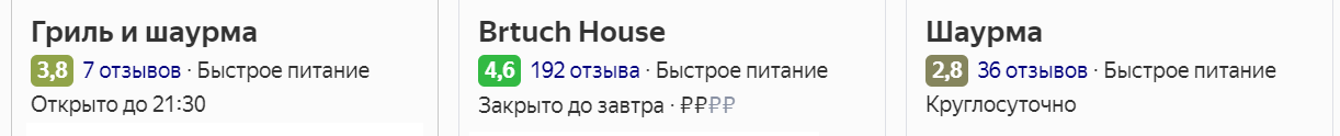 In the company card in Yandex search results, you can see the color indication of the rating. The colors vary from dimmer shades to bright green: the brighter the color, the higher the rating.