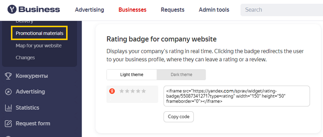 Get the code. In the About the business → Promotional materials section, go to the Badge block and click Copy code.