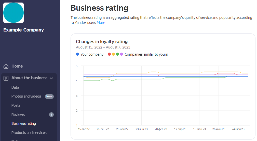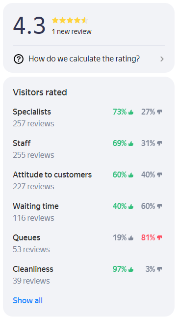 The rating in Yandex Maps, Yandex Search, and Yandex Business is compiled separately from other Yandex services.