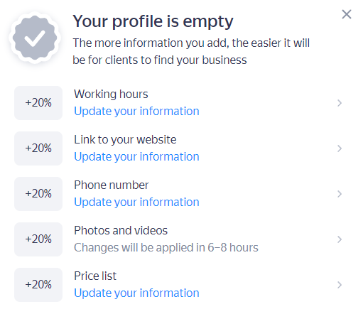 A representative updates the company information in the Yandex Business account at least once a quarter.