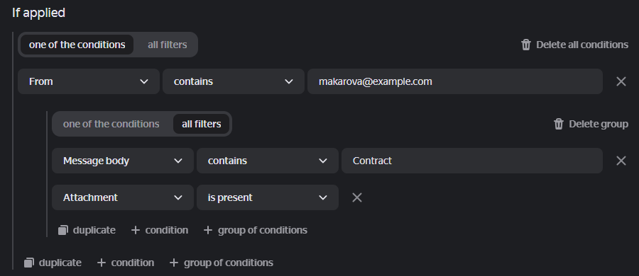 For example, an employee receives emails from colleagues and one specific client, as well as responds to all inquiries about contracts (with a file attached). This employee is going on vacation, and you want to set up filters so that emails from that one specific client and contracting inquiries are forwarded to another employee. To do this, you need to add one regular condition, as well as two grouped conditions: