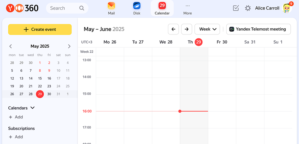 To open Yandex Calendar, go to calendar.yandex.com.