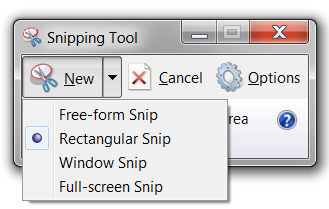Choose a mode: rectangular or free-form snip. Press New and take a screenshot of a window or the entire screen.