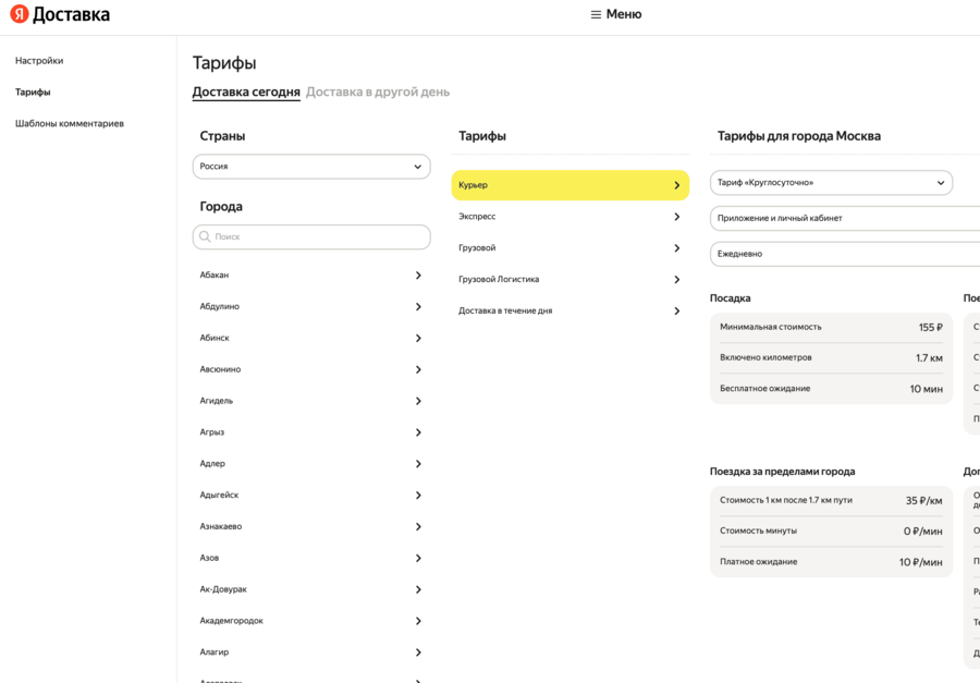 На вкладке Профиль откройте раздел Тарифы — выберите нужный город и тариф. Здесь вы можете найти детальную информацию по всем тарифам для каждого города.