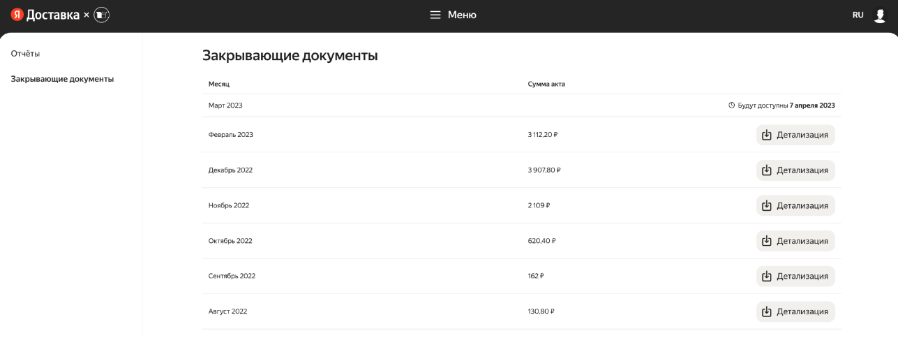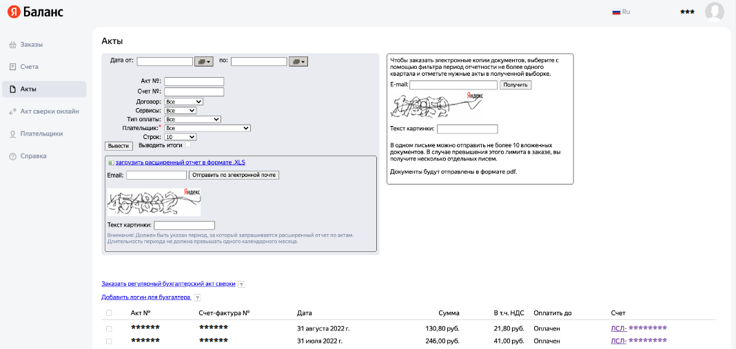 Также закрывающие документы хранятся в личном кабинете Яндекс Баланса: