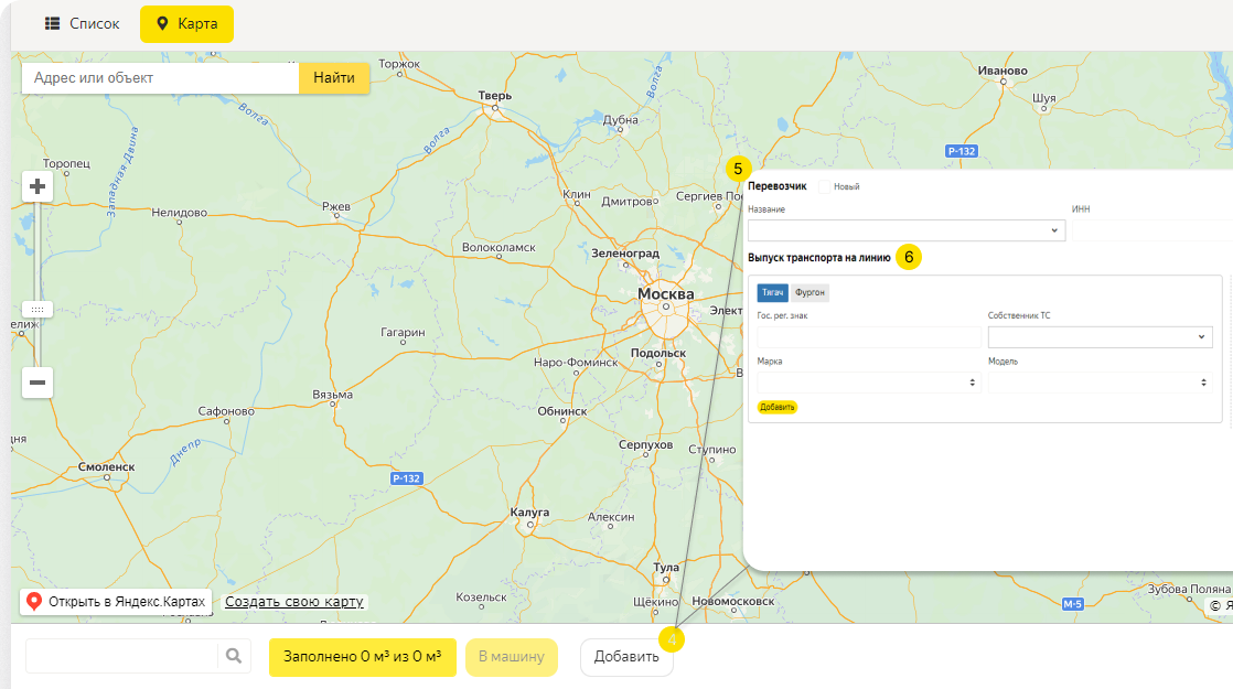 Добавленные транспортные средства и водители будут отображаться на карте в виде карточек.