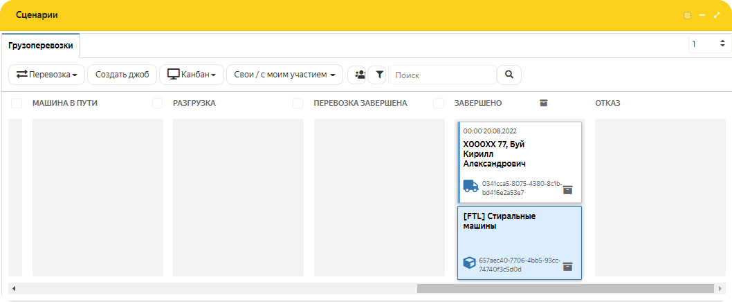 На канбан-доске Сценарии после смены всех статусов и завершения рейса заказ автоматически перейдет в раздел Завершено.