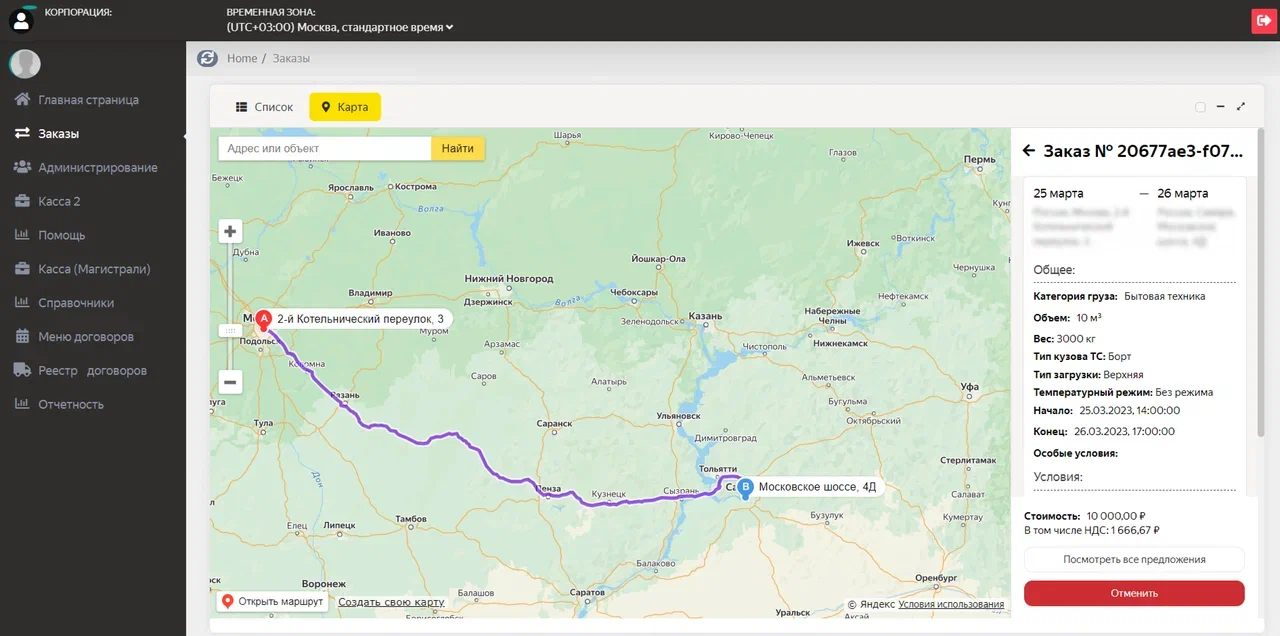 Нажмите на строку с нужным заказом — справа откроется карта с маршрутом и карточка заказа.