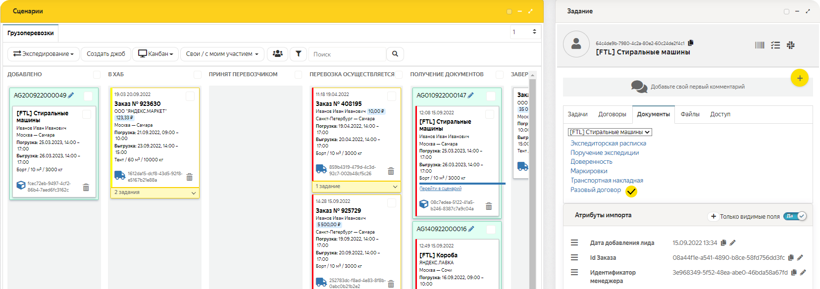 На доске Сценарии найдите заказ, на который был назначен или выбран исполнитель-грузоперевозчик, и нажмите на него. Справа от доски Сценарии откроется панель Задание.