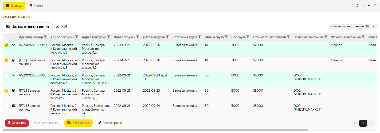 Вы можете объединить заказы в один рейс. Для этого отметьте нужные грузоместа в единый рейс: